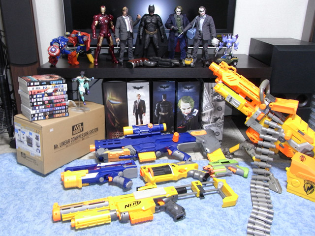ポップな武器はNERFっつって海の向こうではこれをハード塗装するのがその筋で流行っています。発射するのはスポンジの弾で、射程距離も10mないナイスな室内兵器です。で、大っきい箱はエアスプレー。俺はやる気だぜ。